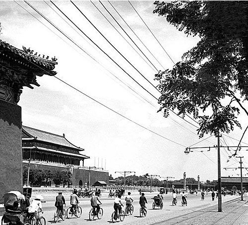 1956年2月15日,北京、天津、唐山、保定、石家庄、张家口六城市青年自行车比赛在北京举行。图为比赛结束后,青年们骑车经过东长安街的情形。