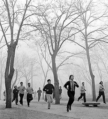 1957年1月3日清晨,北京的年轻人在东长安街的林荫道上跑步