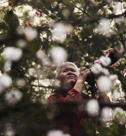 摄影老人在花丛中寻找花儿的春天