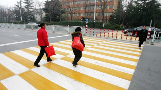 日前,“彩色斑马线”正式亮相山东省潍坊市区主干道路,据了解,传统的斑马线是白色条纹,但这种新式的彩色斑马线一半是黄色一半是白色,黄白相间斑马线形成良好的立体视觉效果,起到了对机动车驾驶人明显的减速慢性和礼让行人警示作用,使得交通标线更加清晰、醒目、人性化。