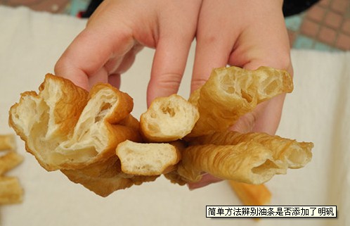 鉴别油条是否添加明矾超标,就是趁油条还热的时候,掰开后,用鼻子大力的吸几口,如果感到特别刺鼻,那就证明你目前吃的油条存在严重的明矾超标问题。