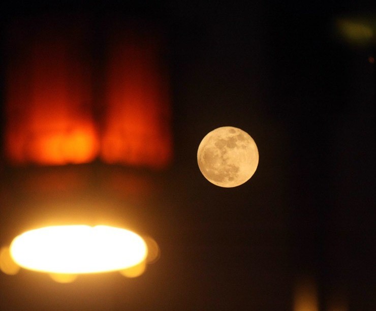 《超级月亮》:2012年5月6日晚,一轮“超级月亮”高挂青岛上空,与城区建筑、灯光相映成趣。 所谓的“超级月亮”是指处在近地点上的满月。5月6日是农历四月十六,正值“望”时,即月亮最大最圆的圆满时刻;当天月球又恰好运行至近地点,地球与月球之间的距离为全年最近,因此月亮的视觉直径最大。专家介绍,月球轨道为椭圆,距地球最近时约35万公里,最远时约40万公里。因距离不一样,公众眼中的月亮也就有了“大月亮”和“小月亮”之分。天文专家表示,“超级月亮”系正常天象,不会影响人类的正常生活。