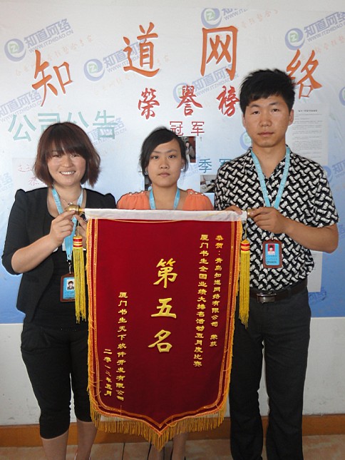 2012年5月份知道网络业绩突出,在全国近百家代理商中,取得了第5名的好成绩,总部特地送锦旗以资奖励。同时,这也是青岛知道网络服务客户剧增的体现。非常感谢信任我们的客户们,有了你们,才有了今天的我们。同时,我们将会把您的信任转化成我们的动力,再接再励,为你们做好服务,以达共赢!