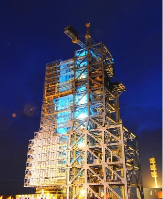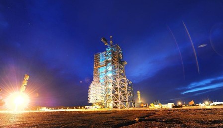 矗立在夜色中的神九发射塔架(6月13日摄)。西北大漠戈壁滩上的东风航天城,宁静被打破,中国乃至世界的目光聚焦于酒泉卫星发射中心一处湖蓝色的发射塔架。塔架内是神舟九号载人飞船和长征二F遥九火箭组合体,它们正等待3名中国航天员的“登机”,然后一起飞往太空,与天宫一号目标飞行器进行交会对接。这是继去年11月无人乘坐的神舟八号飞船与天宫一号进行自动交会对接后,中国首次实施由航天员来完成的手动空间交会对接任务,将为2020年前后建造空间站奠定基础。