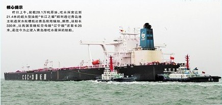 昨日上午,装载28.1万吨原油、吃水深度达到21.4米的超大型油轮“长江之耀”顺利通过青岛港主航道深水航槽抵达青岛前海锚地。据悉,该船长330米,比我国首艘航空母舰“辽宁舰”还要长26米,是迄今为止驶入青岛港吃水最深的船舶。