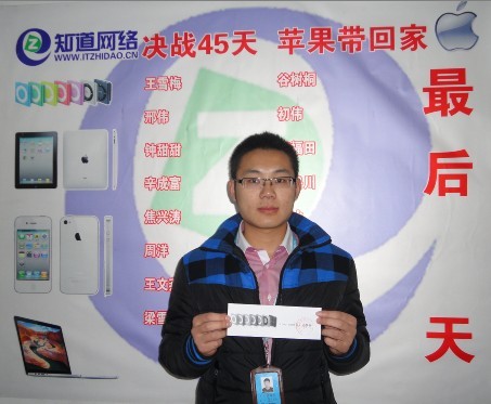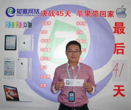 首先,公司的奖励是很给力的,在给力的奖励政策下,总会有人先富起来的。所以,在今天特殊的日子里,我们又诞生了一个销售工程师,同时,我们的第一个苹果的mp3,第一个ipad2已经送出。让我们把今天最热烈的掌声送给知道网络的新诞生的销工:席销工!