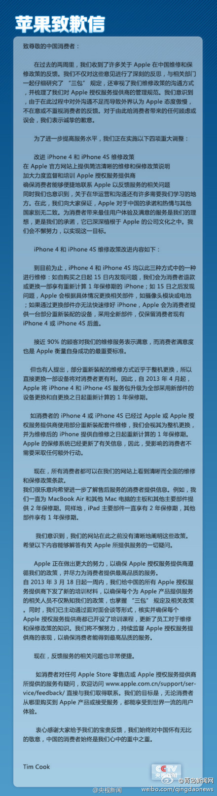 4月1日晚,苹果官网发布Tim Cook落款致消费者信,明确了苹果产品的保修期、其中iPhone 4和4S的售后有升级。