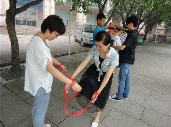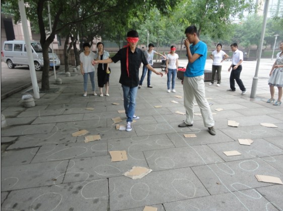 第二个环节叫做越狱,我们在地面上用粉笔画出一片区域,里面摆放很多硬纸壳作为地雷。每队各派一位队员穿越雷区,这位队员需要蒙住眼睛,在其他队员的指挥下,在不踩到地雷的情况下,从雷区的一段走到另外一端。哪个队成功的人数多则为获胜组。