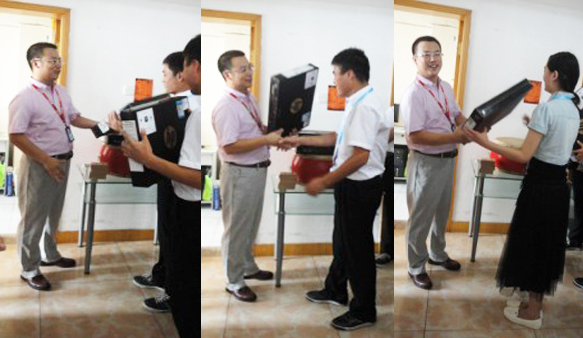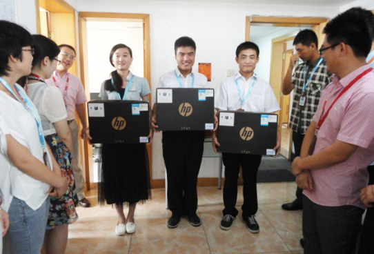 由于有三位新同事没有自己的笔记本电脑,因此公司出面为他们配备了新的笔记本电脑,我们的曲总亲自为他们购回笔记本并颁发到他们手中。