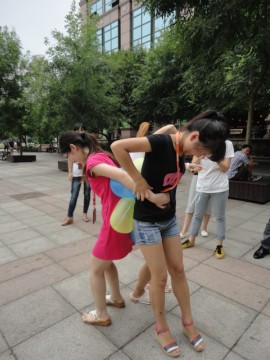三位美女接受惩罚——把未踩破的气球挤破
