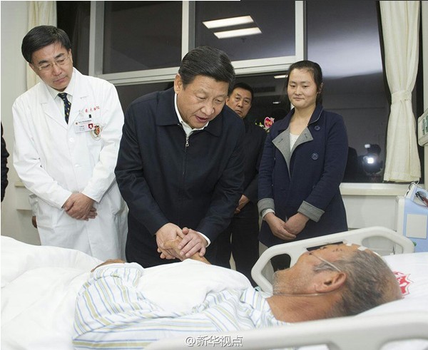 新华网北京11月24日电 据新华社“新华视点”微博报道,24日下午,到山东省考察的习近平总书记专程前往青岛大学附属医院黄岛分院,亲切看望“11·22”中石化输油管线泄漏引发爆燃事故受伤人员。总书记询问伤员中年龄最大的87岁老人薛淑美的伤情,叮嘱医护人员精心治疗护理,使老人早日康复。习近平还看望部分遇难人员亲属,向他们表示深切慰问。