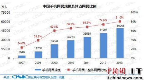 今日,中国互联网信息中心发布了第33次《中国互联网络发展状况统计报告》(以下简称报告)。报告显示,截至2013年12月,中国手机网民规模达5亿,较2012年底增加8009万人,使用手机上网网民比例保持较快增长,从74.5%上升至81.0%,提升6.5个百分点。
