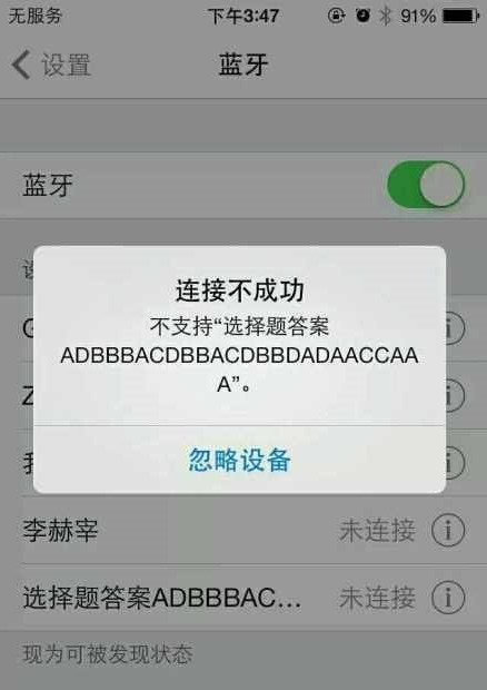 以为有了信号屏蔽器我就没办法了?看看我神奇大蓝牙。答案照样抄到不解释。原来信号与蓝牙的通信信道不一样,所以信号屏蔽器是无法屏蔽蓝牙的。