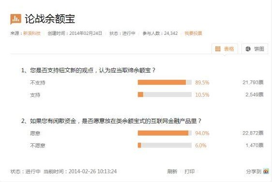 2月26日上午消息,近日在由新浪科技发起的“论战余额宝”调查中,截至目前89.5%的用户反对钮文新的观点,认为不应该取缔余额宝。同时,有94%的用户表示,如果自己有闲散资金,会选择将其放在余额宝等类似的互联网金融理财产品中。
