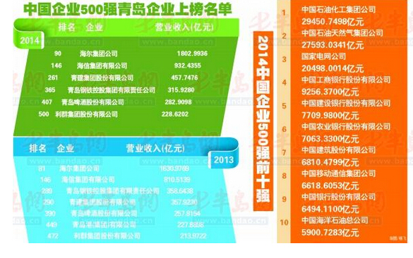 中国企业联合会、中国企业家协会2日发布“2014中国企业500强”榜单,中石化、中石油、国家电网分列榜单前三位,中农工建四大国有银行全部进入前十,榜单的前37名均为国企。记者查看榜单发现,青岛企业有6家入围,比去年少了一家,据介绍,落榜的企业是因为上市前期没有申报。