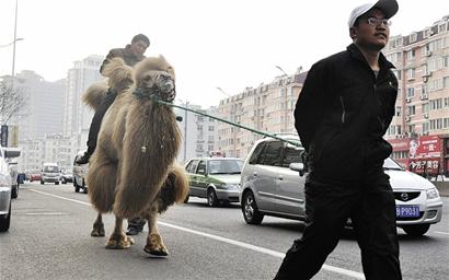 记者跟随“巡街”的骆驼继续前行了100多米,这时两名交警接到司机举报赶到,将两人拦下,要求他们立即将骆驼赶下快速路,并联系酒店派车将骆驼拉回去。“市区主要道路都是禁止畜力车通行的,动物园或者马戏团如果要赶着骆驼等动物通过马路,必须到公安部门申请特批,也只能在深夜凌晨不影响交通的情况下通行。”记者从交警处了解到,两人行为已经违反了交通法规,需要公安、城管和卫生检疫等多个部门联合处理此事。