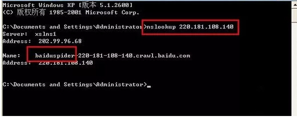 依次点击“开始—运行”,输入“cmd”,使用命令“nslookup +ip(要查询的IP)”查询,输入:220.181.108.140,如下图所示,表明是正常的百度蜘蛛;