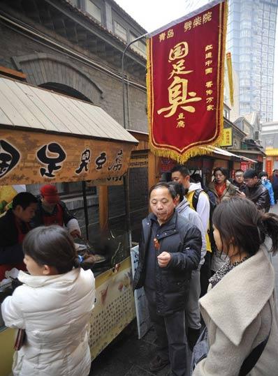 在青岛,这是一个特有的场景,一群人排着长长的队,在等待刚出锅的鲜炸臭豆腐。