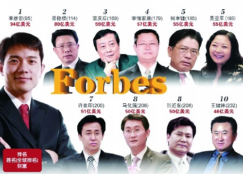 在福布斯富豪榜中,百度CEO李彦宏取代宗庆后成为今年中国大陆首富,上榜的个人财富是94亿美元,排名第 95位,这是中国大陆富豪首次进入百强。三一重工的梁稳根以80亿美元排富豪榜114位,娃哈哈的宗庆后以59亿美元位列169位,制药行业的李锂家族以57亿美元位列179位。另外,腾讯马化腾以50亿美元列 208位,丁磊26亿美元列440位,该份千人榜单最后一名为新进榜的中国新东方教育科技集团总裁俞敏洪。