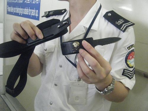 当该旅客的随身行李通过X光机后,开机员通过对图像认真判断识别,发现包内有类似腰带扣的物品,但图像又与其它腰带扣图像有点不同,便立即通知开箱包员进行开包检查。在将疑似腰带物品取出时,旅客一直在旁边辩解说“没什么,就是一条腰带,快点,我时间来不急了”,但工作人员还是对腰带进行了认真观察及试操作,结果发现该腰带的腰带扣竟是一把匕首,匕首插在腰带中间,伪装十分巧妙,从外观上根本无法分辨出来。
