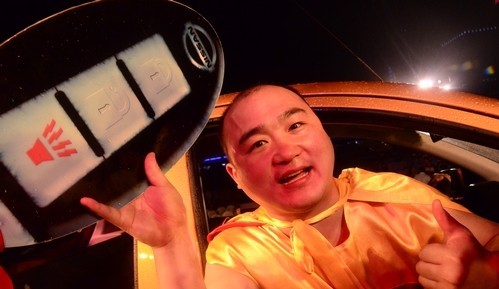 再次摘取“酒王”桂冠,坐在刚刚赢取的玛驰轿车上,李保成将头探出车窗,不住地大声呐喊,显然抑制不住获胜的喜悦。
