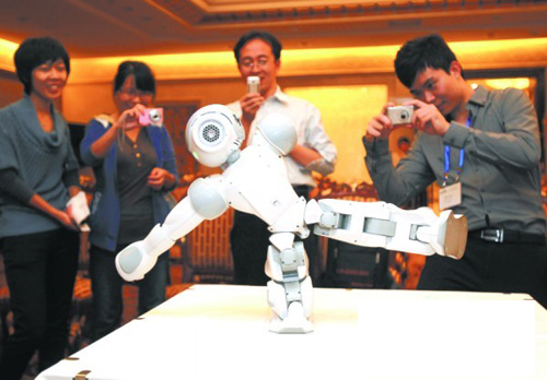 9月18日,来自法国的智能机器人“NAO”来到青岛“参加”控制与智能、自动化与机电系统国际会议,它能模仿迈克尔·杰克逊跳舞,摔倒了能自己爬起来,甚至还能打太极拳……