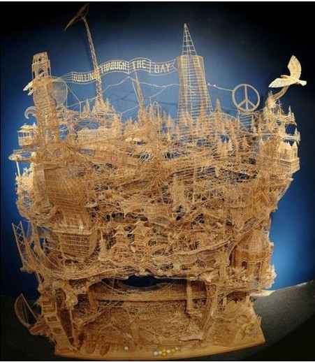 美国艺术家斯科特·维沃尔虽然只是超市工作人员,却擅长牙签雕塑。为了表达他对家乡旧金山的热爱,维沃尔花了34年、耗费了10万根牙签打造了旧金山的城市街区以及历史古建和知名地标性建筑物,如金门大桥、伦巴德街和艺术宫。雕塑还暗藏机关,可供乒乓球从头“游览”到底。