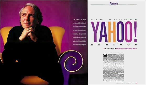 蒂姆·库格尔(Tim Koogle),于1995年8月加盟雅虎公司,成为雅虎首任CEO,时年49岁。1983年,库格尔加入芝加哥摩托罗拉公司,1992年担任位于西雅图的数据服务公司 InterMec(发明条形码的公司)总裁。