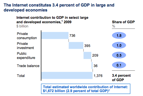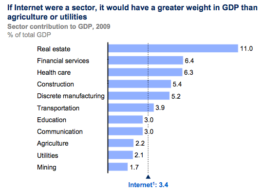 作为一个产业,互联网对于经济的贡献多于传统的矿产开采、公共工程、农业以及教育。在瑞典,过去五年里三分之一的增长与互联网产业的发展密不可分。在G8,这个平均水平为21%。麦肯锡研究了从上个世纪90年代中期到现在的情况,他们分析发现,互联网创造的就业机会比它摧毁的岗位要多出来两倍,这就有力的回击了很多人认为互联网将夺走人们就业机会的说法。