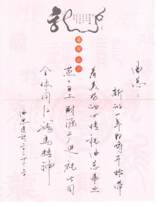 新春的气息真的越来越浓了,然而再冷的天也难挡浓浓亲情,我们远在龙口的姐夫寄来了新春的祝福,感谢姐夫,不过要是明年给全公司的员工都寄一份来就更完美了,嘿嘿……