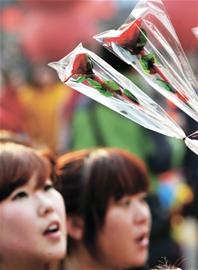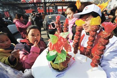 情人节临近,糖球会上的不少民俗艺人也纷纷凑热闹,亮出了自己的“民俗玫瑰”:糖球玫瑰、面塑玫瑰、糖稀玫瑰、糖画玫瑰……各种玫瑰新品种吸引了许多赶会的年轻人。